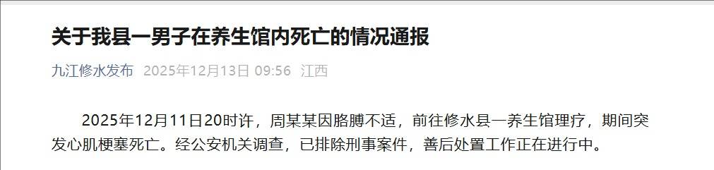 2025年12月11日20时许,周某某因胳膊不适,前往修水县一养生馆理疗,期间突发心肌梗塞死亡。经公安机关调查,已排除刑事案件,善后处置工作正在进行中。